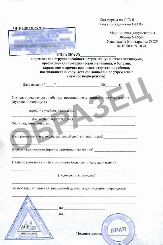 Справка формы 095 У или 095 являются законным документом, оправдывающим отсутствие на рабочем месте или лекциях. Разница между ними заключается в том, что первый вариант больничного листа дает право не посещать работу или учебу сроком до 1 месяца. Форма 095 – две недели. Обратите на этот аспект внимание, когда будете заказывать документ.